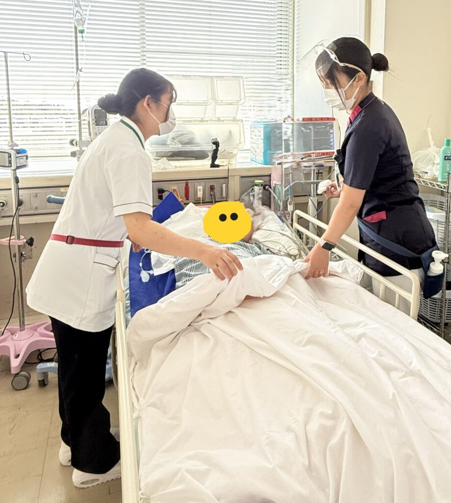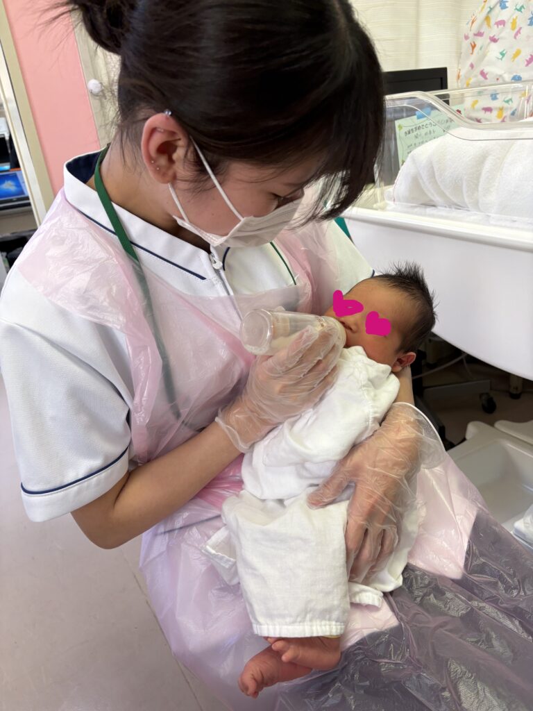 周産期センターでの研修です。赤ちゃんの授乳。上手に優しく包むように抱っこできています。赤ちゃんも穏やかな表情で、ゴクゴクと飲んでます。周産期センターで、新しい命に出会うと、「大切にしたいな」「すくすく育ってね」の気持ちが自然に湧いてきますね。