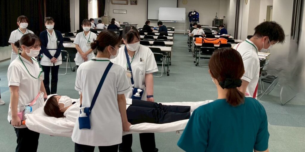 初めての担架搬送の訓練です。「1・2」「1・2」と声をかけ合い歩みを揃えます。安全に患者さんを搬送しましょう。