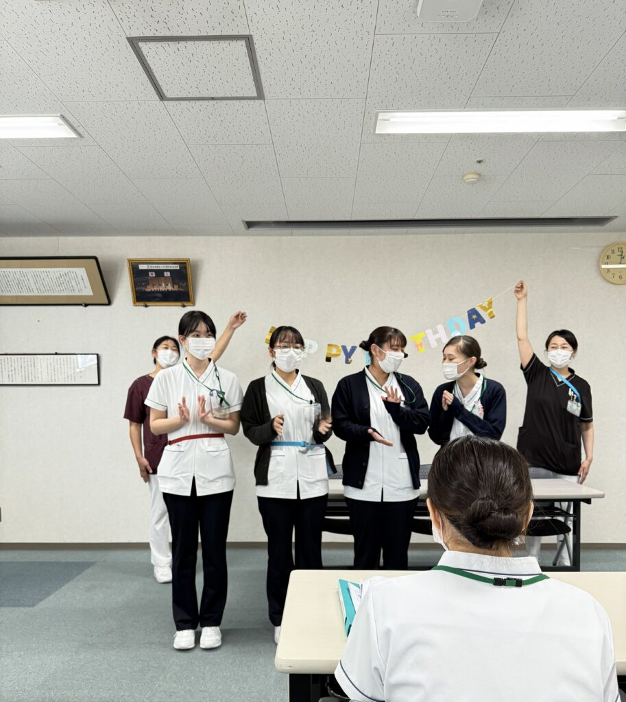 今月は4人の新人看護師の誕生月です。皆で「はっぴばーすでい♪♬ てゅー♪ゆー♩(^^♪」を合唱して、お祝いします。