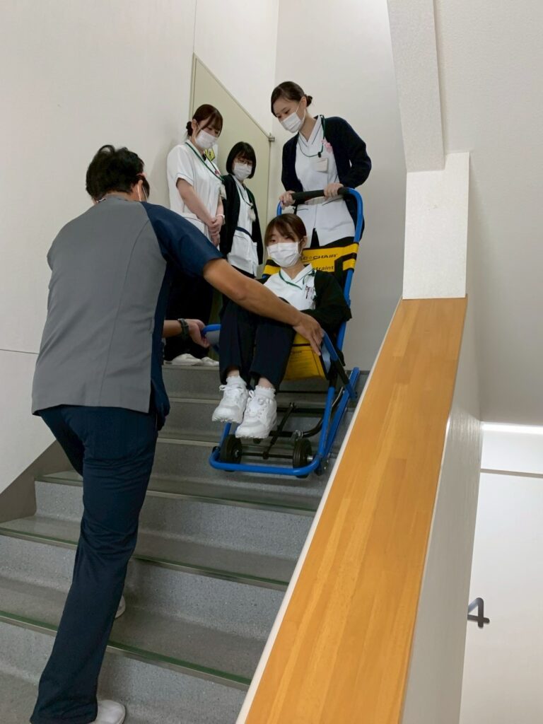 階段からの車いすでの搬送です。DMAT隊の先輩看護師の見守りの中、慎重に下降します。コツをつかむと滑るように階段を下降できますね。