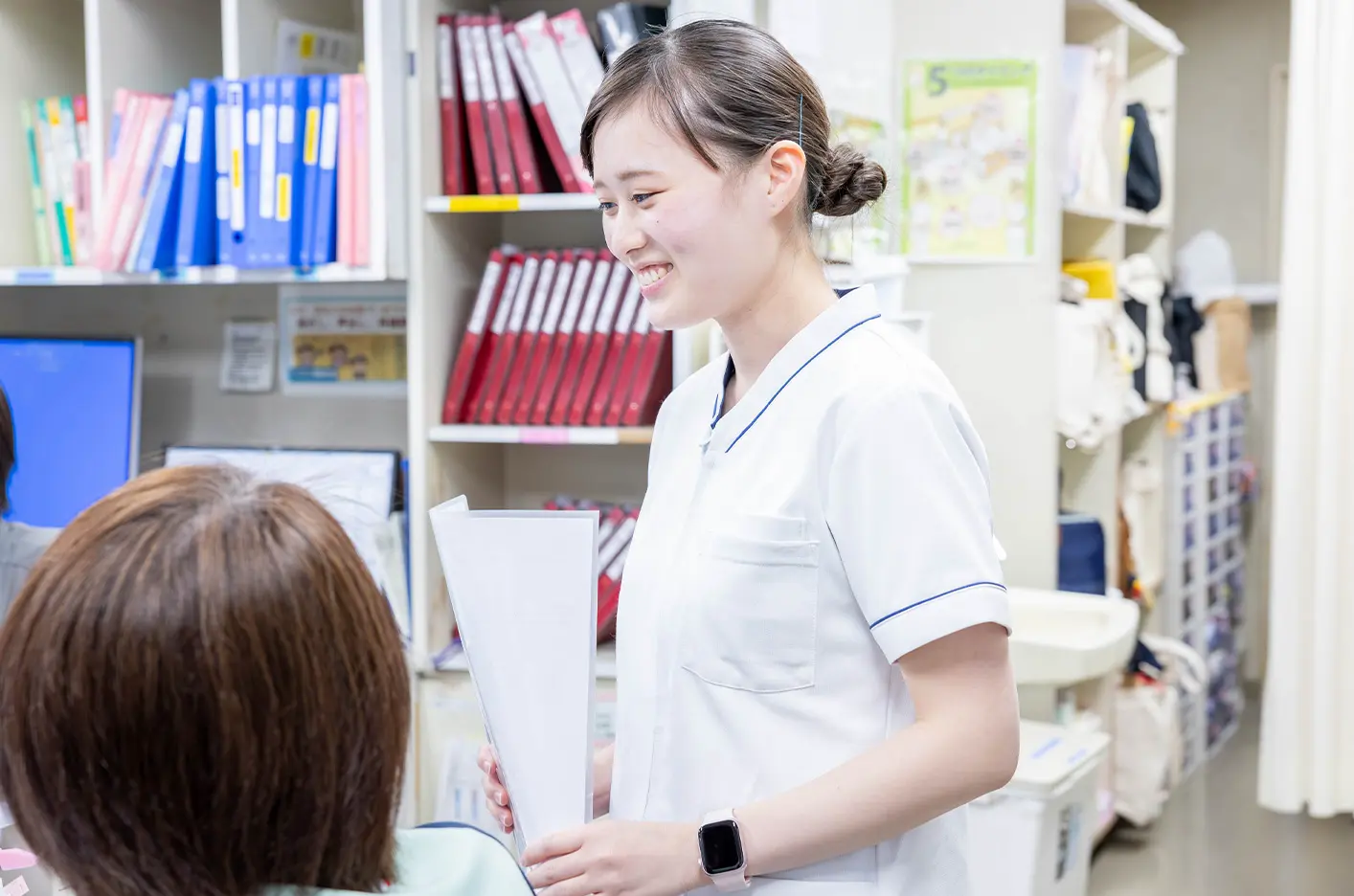 私は現在、整形外科病棟で働いています。手術を目的とした患者様が多く入院されており、術後の急性期看護、ADL拡大に向けた回復期の看護など、患者様の状態に応じた身体的・精神的・社会的なケアを提供しています。忙しい病棟ですが、優しく明るい先輩方にサポートしていただき、温かいご指導のもと業務に集中して取り組むことができています。
